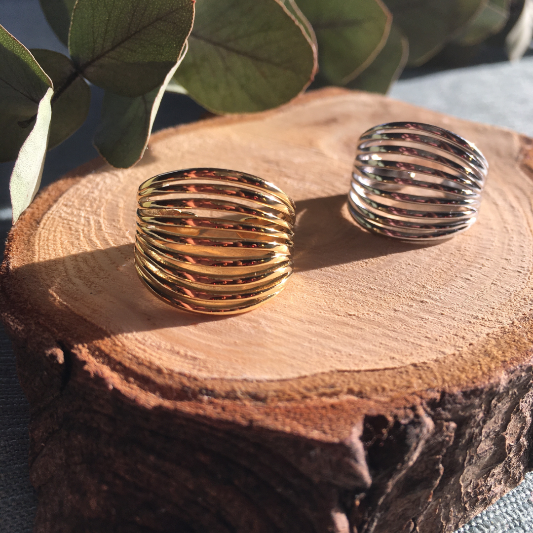 Moderne brede ring. Beschikbaar zowel in goldplated als silverplated roestvrij staal. Blijft mooi. Verstelbaar zodat je hem aan elke vinger kunt dragen. Geef aan welke kleur je verkiest.